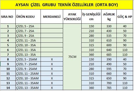 - Çizel 3 tiptir: Kısa BACAK bahçe tipi, STANDART boy BACAK,Yüksek BACAK çizel olarak üretim yapılır.Ayrıca opsiyonel Yüksek BACAKLI Kulaklı Uç Demirli Çizel olmak üzere üretim yapılmaktadır.