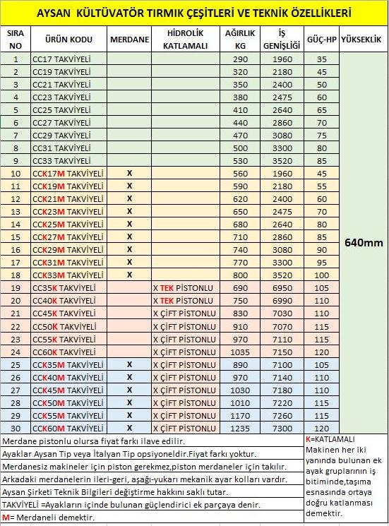 - Çizelgede belirtilen beygir güçleri(Hp) traktör markasına ve toprak özelliklerine göre ± %20 değişiklik gösterebilir.