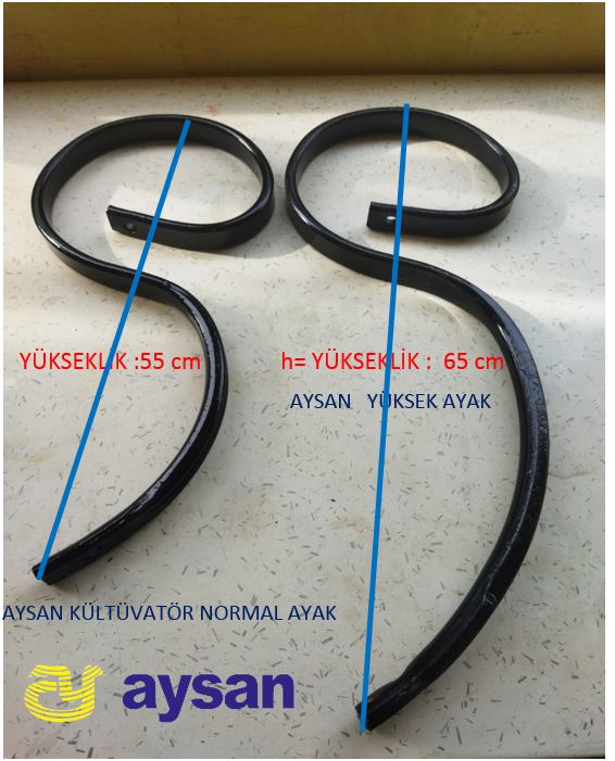 - Yüksek Yay Ayak ölçüleri : farkı sadece ayak uzunluğu ve Yüksekliğidir.Standart Aysan Ayaktan 10 cm (65cm)yüksektir.Daha derin toprak işlenmesinde ve tarla atıklarının,ot ve sapların çok olduğu toprak yüzeyi işlenirken topaklanma yapmaması için yüksek ayak tercih edilebilir.Standart ayağa göre malzemeden kaynaklı az da olsa fiyatı daha fazladır.